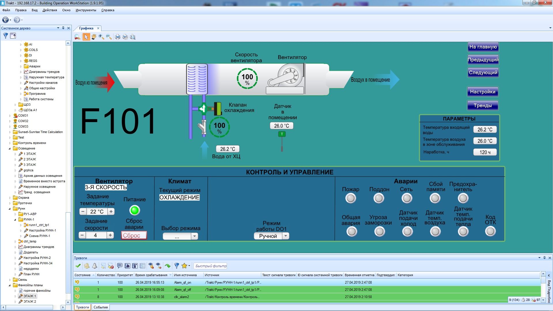 - контроль и защита по Т обр. воды, Т макс и Т мин. приточного воздуха;