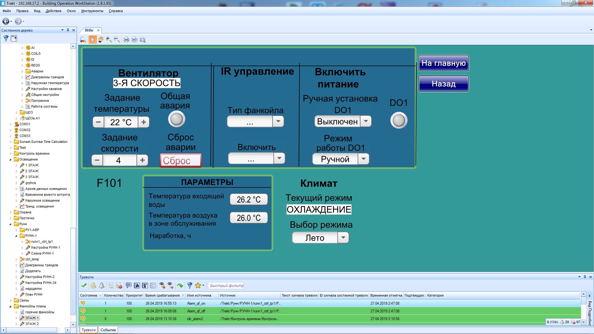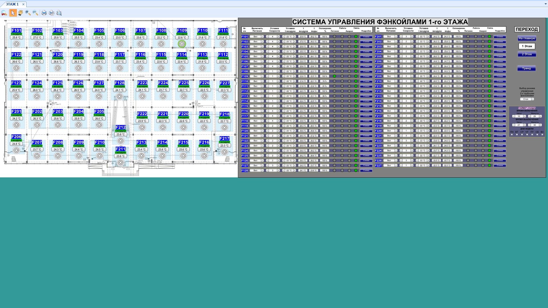 - ручное и автоматическое (по потребности) управление скоростями вентилятора, смена режима «нагрев» - «охлаждение» (в т. ч. по двухтрубной схеме);